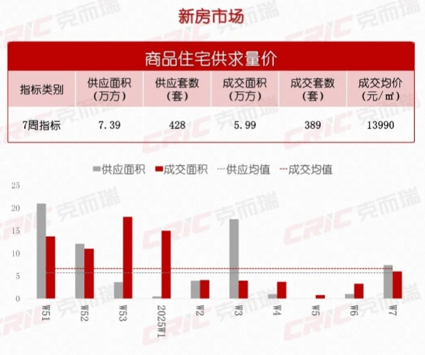另据克而瑞湖南区域数据,上周,即2月15日至2月21日,长沙内五区一手住宅成交389套、5.99万方,成交均价13990元/㎡。